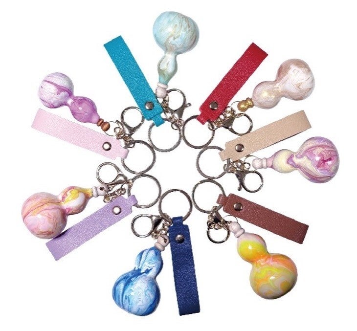 種から育てた本物のひょうたんをモチーフにしたキーリングは、一つひとつ異なるマーブル模様とやわらかな色合いが魅力。手に取るたびに自然の息遣いを感じる、世界に一つだけのアクセントです。