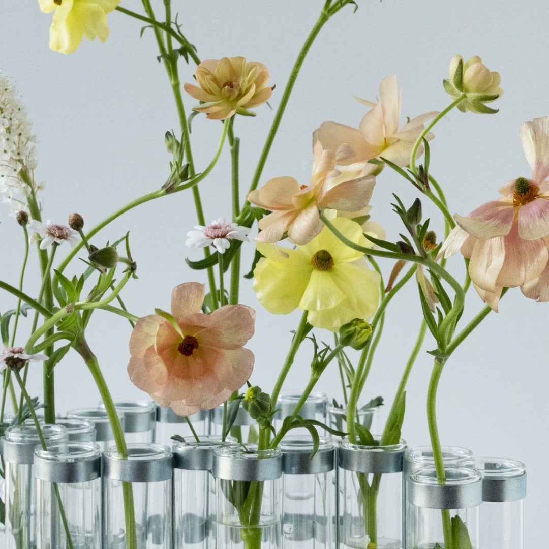 本特集では、1本の花を1本ずついける連結式のガラス花器「四月の花器」の魅力を特集しています。掲載商品は、オンラインショップ「トンカチストア」( https://shop.tonkachi.co.jp )にて販売中です。