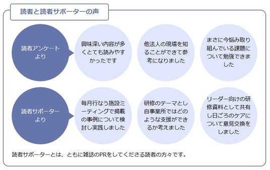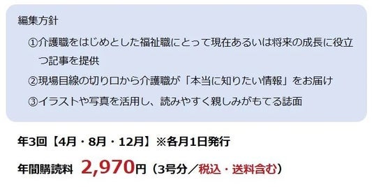 毎号変わる特集テーマと、幅広い分野の連載記事。福祉の現場へ最新の情報をお届け!現場で働くすべての皆様を元気づけられる雑誌、専門性を高める情報マガジンを目指しています!