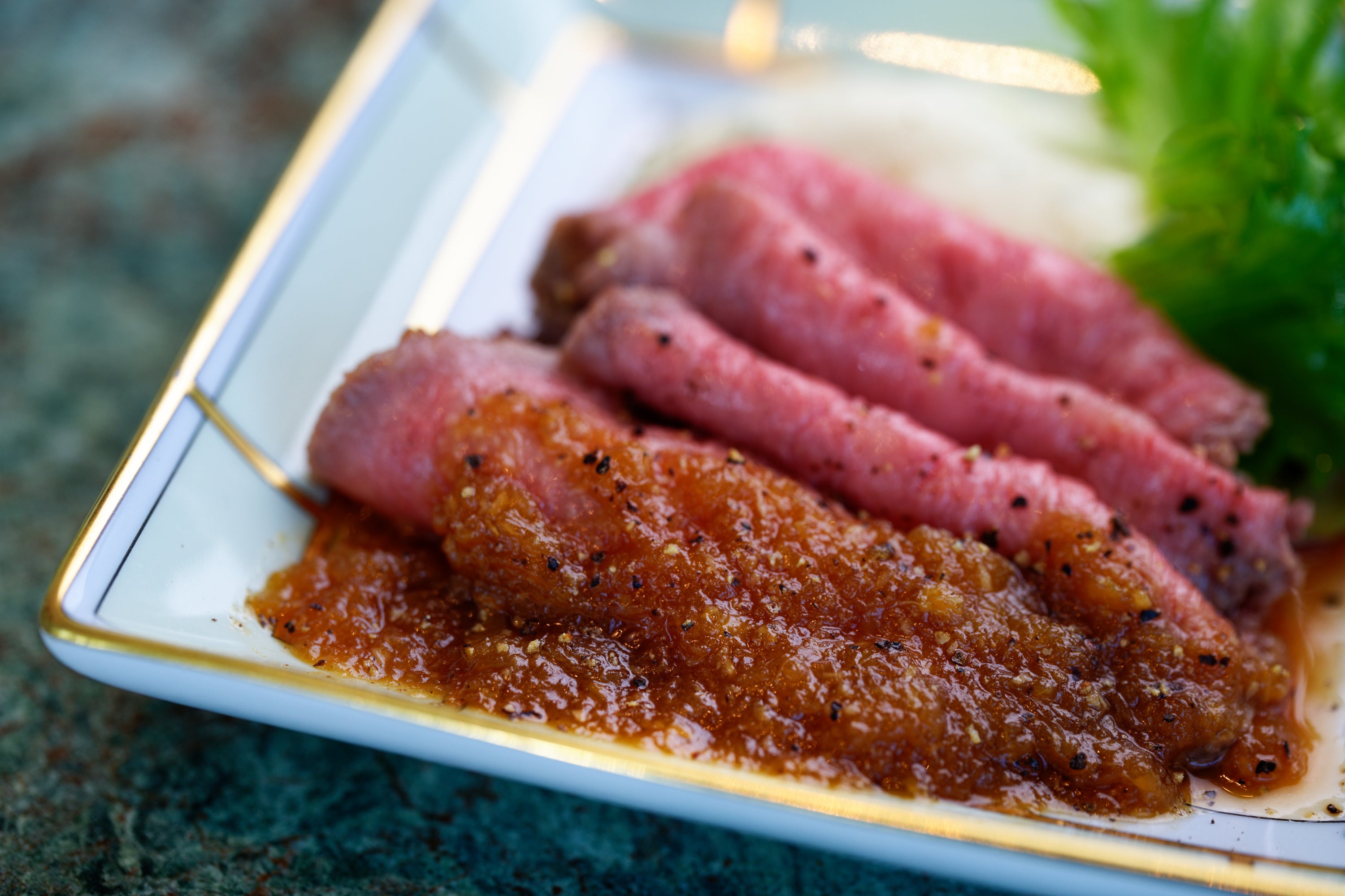 ・ 黒毛和牛のローストビーフ シルキーマッシュポテトと山わさび風味のグレイビーオニオンソース