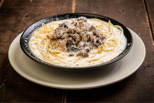 どろっと黄身がとろける半熟卵とベーコン、胡椒のアクセントが聞いたカルボナーラ風!