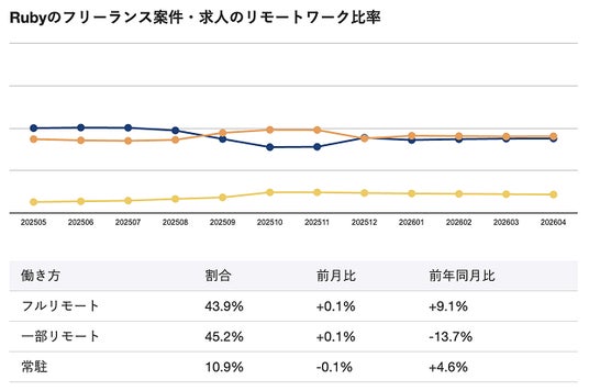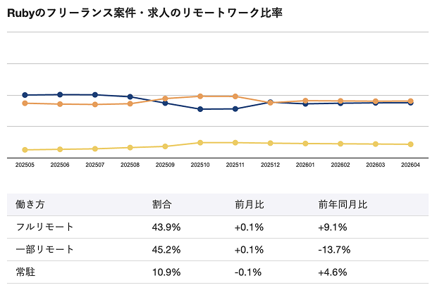 2026年4月時点のRuby向けフリーランス案件・求人におけるリモートワーク比率は、フルリモートが43.9%、一部リモートが45.2%、常駐が10.9%となっています。