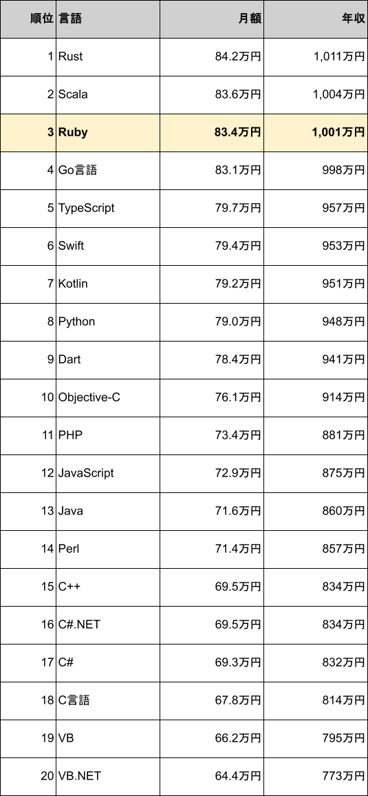 Ruby案件の平均月額単価は83.4万円、平均年収は1,001万円で、プログラミング言語別の年収ランキングでは3位に位置しています。