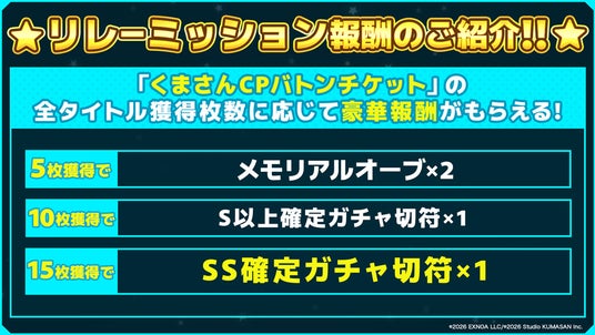 ■「くまさんCPバトンチケット」を集めて、豪華報酬をGET!「リレーミッション」開催!