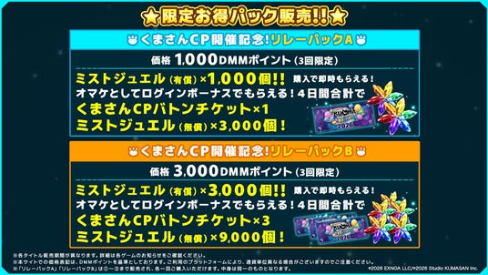 「リレーミッション」の参加に必要な「くまさんCPバトンチケット」や、ミストジュエルがお得に手に入る特別な販売物になっておりますので、お見逃しなく!