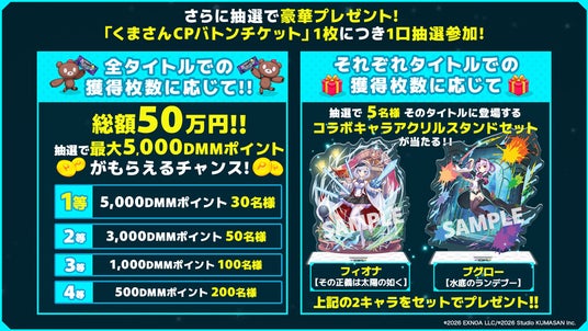 さらに!「くまさんCPバトンチケット」1枚につき一口抽選参加で、最大5,000DMMポイントや「コラボキャラアクリルスタンドセット」が当たるチャンス!