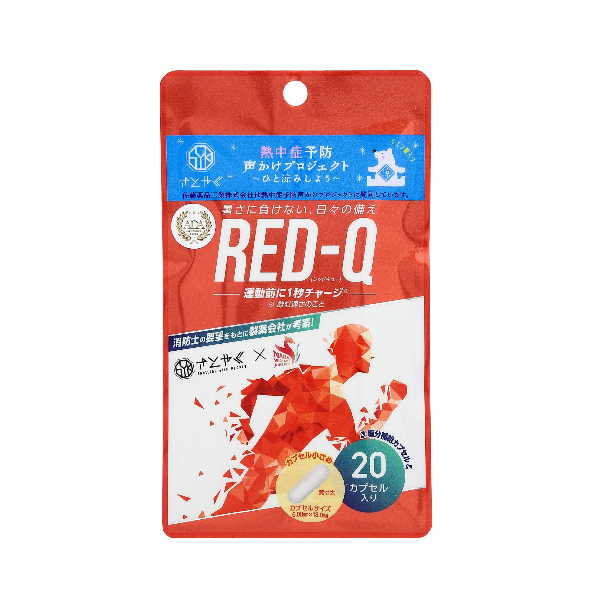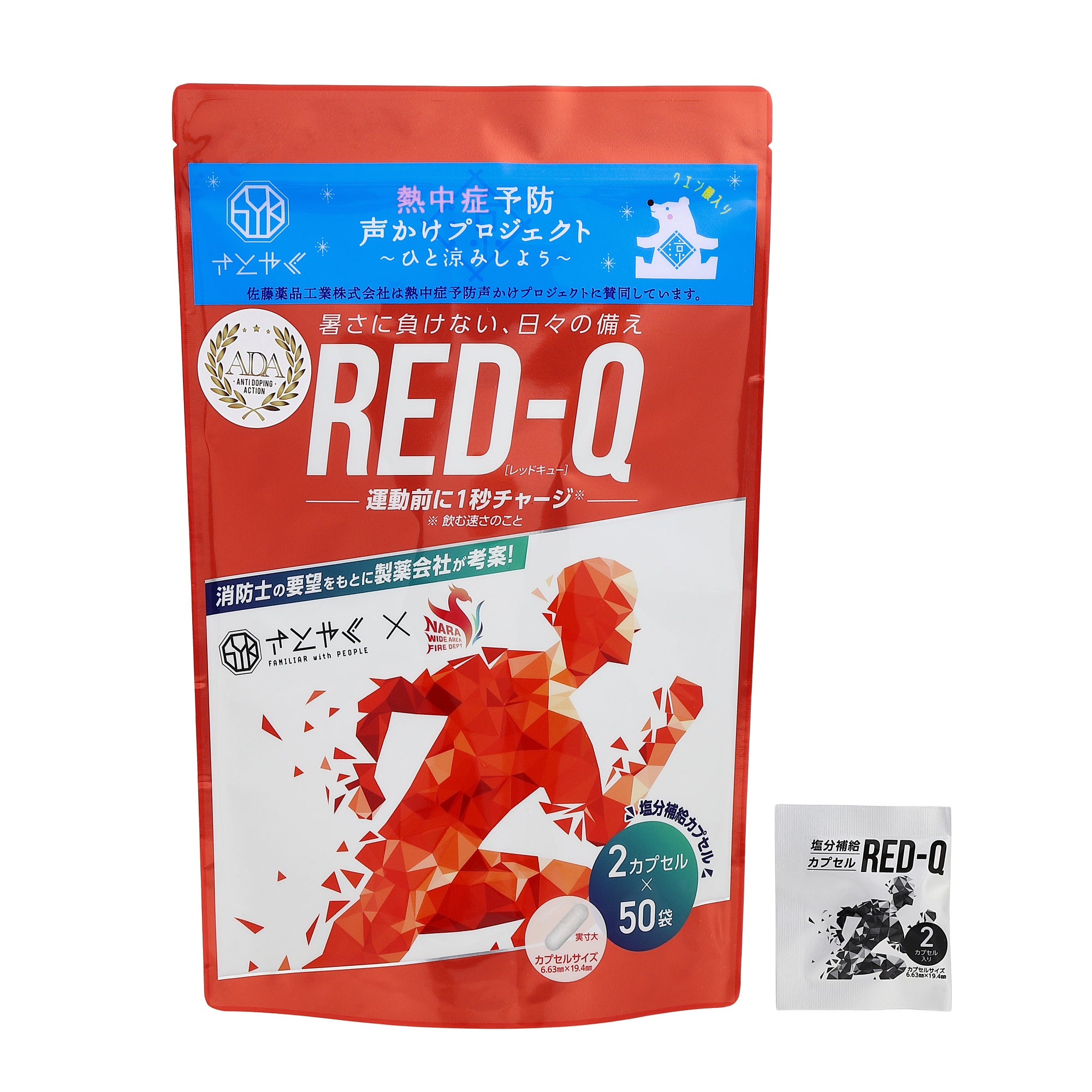 奈良県広域消防組合消防本部と佐藤薬品工業のコラボで、消防士の要望をもとに考案した塩分補給サプリメント「RED-Q」※1は、去る3月11日に、日刊工業新聞社主催の「第36回 読者が選ぶネーミング大賞」で、生活部門第1位および審査員特別賞をW受賞しました。また、「熱中症予防声かけプロジェクト」への協賛※2や、アンチ・ドーピング分析の実施※3など、より多くの方に安心してご使用いただける取り組みも進めています。
