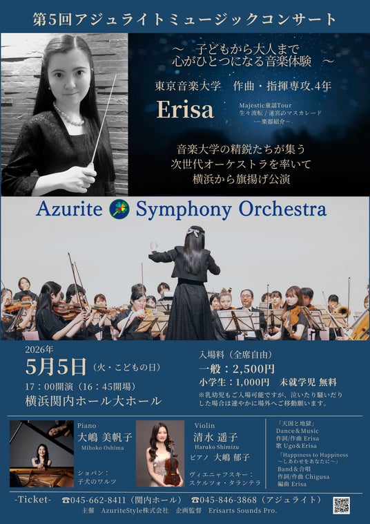 22歳で自身のオーケストラを立ち上げ、自作曲を自ら指揮し、大ホールで旗揚げ公演を行う事例は、世界的に見ても極めて希少です。音大精鋭のみで構成される流動型オーケストラとして、若手プロ人材の実践教育の場にもなっており、“教育から生まれた次世代オーケストラ” という社会性と物語性を持つ、横浜発の新しい文化プロジェクトとして、日本のみならず世界を視野に活動してまいります。「Erisa」東京音楽大学 作曲指揮専攻MMC 4年