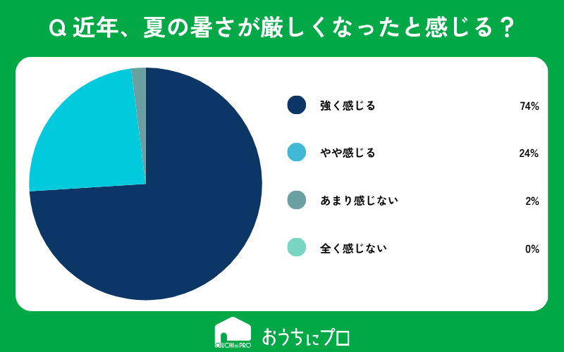- 近年の夏の暑さが厳しくなったと、実に98%もの人が感じている。