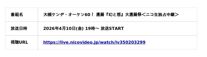 株式会社ドワンゴは、2026年4月10日(金)19時より、EX THEATER ROPPONGIにて開催される「大槻ケンヂ『幻と想』大還暦祭」を、ニコニコ生放送にて配信いたします。本公演はチケット完売のため生配信が決定しました。還暦を迎えた大槻ケンヂの記念公演として、「筋肉少女帯」「特撮」をはじめとした豪華出演者が集結。一夜限りの特別なステージをお届けします。