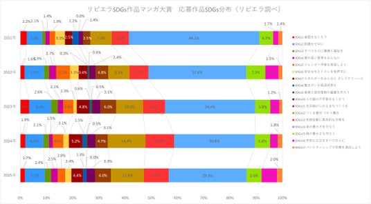 「リビエラSDGs作品マンガ大賞」には、これまで4歳から88歳までという極めて幅広い世代から、累計4,500点を超える情熱的な作品が寄せられてきました。応募作品のSDGs番号の分布推移を紐解くと、それぞれの年齢や立場で刻々と変化する社会を見つめ、「今、伝えたいこと」を形にしてきた軌跡が浮き彫りとなります。創設以来、「海の豊かさを守ろう(目標14)」への関心は圧倒的で、2025年度も29.3%と最大の構成比を維持しました。一方で、身近なライフスタイルに根ざした「つくる責任 つかう責任(目標12)」が2021年の7.2%から12.4%へと約1.7倍に急伸。さらに「気候変動(目標13)」が9.4%、「平和と公正(目標16)」が5.8%に達するなど、異常気象や国際情勢といった現代社会の切実な歪みが反映される結果となりました。