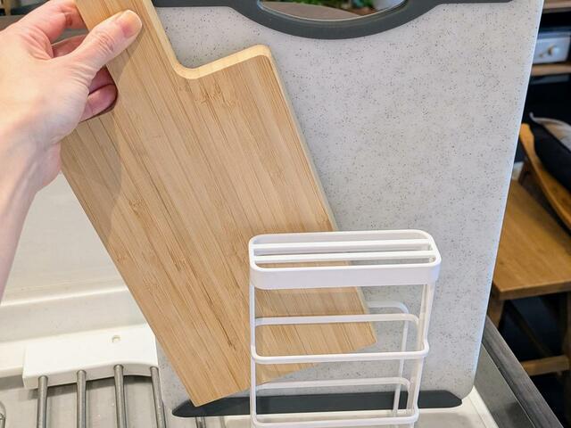 このアイテムの最大の魅力は、まな板と包丁をセットで収納できるところ。最大でまな板を2枚、包丁を3本までまとめて立てられます。
