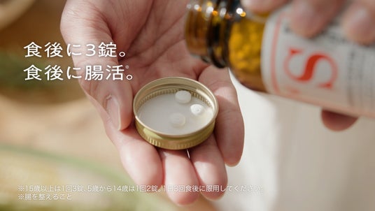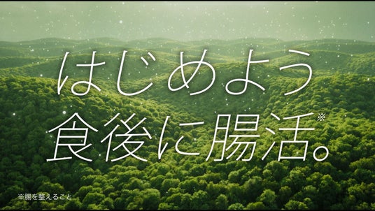 その問いかけに応える形で、岡田さんが新ビオフェルミンS錠を掲げて「それなら、ビオフェルミン。」と紹介。「食後に3錠、食後に腸活※。」というナレーションとともに、ビフィズス菌や乳酸菌が腸内で働く様子を表現したイメージカットへと展開し、「生きた善玉菌が腸を整える」ことを印象づけます。再び森のキッチンの場面に戻ると、太陽の光に包まれた岡田さんが「はじめよう、食後に腸活※。」とやさしく呼びかけます。