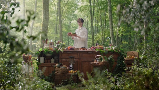 ■「森のキッチン」篇「ビオフェルミンの森」シリーズ第5弾の舞台は、木々に囲まれた明るい森の中に佇む森のキッチン。森の番人こと岡田さんが、並べられた野菜や果物などの食材を吟味しながら立っているシーンから始まります。カメラに気づいた岡田さんはやさしく微笑み、おなかに手を当てながら「おなかによい献立を毎日考えるのは大変ですよね」と、日々の献立づくりの大変さを視聴者に問いかけます。