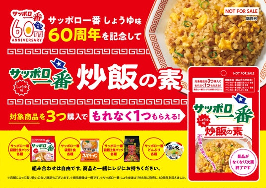 「サッポロ一番 しょうゆ味」60周年を記念して、対象商品を3つ購入いただくと、スープをアレンジした「サッポロ一番 しょうゆ味 炒飯の素」がもれなく1つもらえるキャンペーンを5月より実施します。店頭でお好きな対象商品を3つ選び、「サッポロ一番 しょうゆ味 炒飯の素」と一緒にレジまでお持ちください。