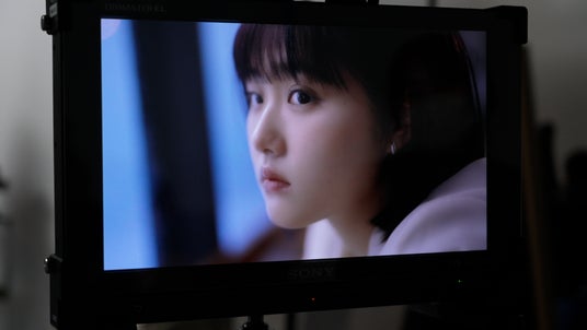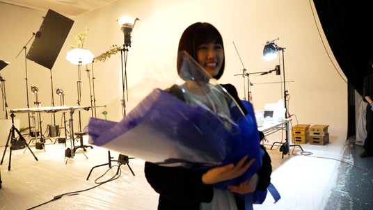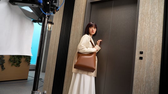 春らしいジャケット姿の原さんがスタジオに登場し、オフィスを思わせる空間から撮影がスタートしました。窓際のカウンターに腰掛け、外の雨を眺めながら、どこか気分が晴れなそうな表情を浮かべます。頬杖をつきながら、どんよりとした空を眺める原さん。撮影後すぐにモニターをチェックし、監督から表情のニュアンスについて説明を受けると、再びカメラ前へ。カメラを長回ししながら、視線や仕草を少しずつ変えていき、繊細な感情の変化を表現していきます。そんな原さんの気分に呼応するかのように、現場も静まり返った雰囲気に。雨音を思わせる水滴の音が聞こえてくるほどの静けさの中で、リアルな空気感のあるカットが生まれました。