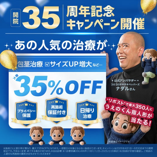この節目を記念し、35周年特設ページの公開、「上野式包茎術」最大35%OFFの記念キャンペーン、そして公式X(旧Twitter)にて「うえのくん指人形」350名様プレゼントキャンペーンを2026年4月1日(水)に一斉スタートしました。