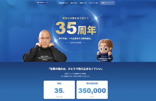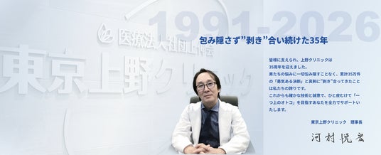 医療法人社団 上伸会(所在地:東京都台東区、理事長:河村 悦宏)が運営する包茎治療専門クリニック「東京上野クリニック」(以下:上野クリニック)は、2026年4月1日(水)に開院35周年を迎えました。1991年の創業以来、「包茎の悩みはひとりで抱え込まなくていい」という信念のもと、誰にも言えない男性の悩みに寄り添い続け、累計35万件以上の診療・相談実績を積み重ねてきました。