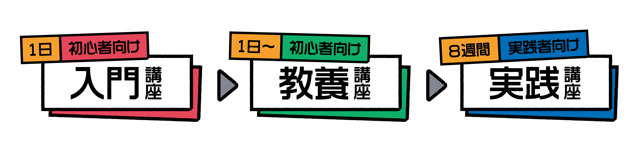 今回のリニューアルにより、入門・教養・実践の3講座を通じて、自分の現在地や関心に応じて学びを選びやすい体系となりました。どの講座からでもご参加いただけます。