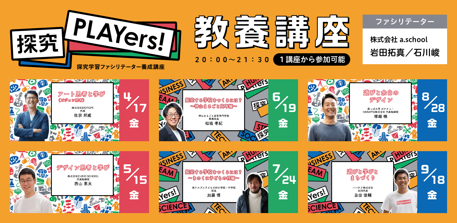 株式会社a.school(本社:東京都文京区、代表取締役:岩田拓真、以下「エイスクール」)は、探究学習を実践・推進する大人のための養成講座『探究PLAYers!』を全面リニューアルしました。新たに、探究学習を多様な理論や実践知から捉え直す単発型の新講座「教養講座」を開設するとともに、既存講座の体系も見直し、より参加者のニーズに応じて学びやすい形へ再編しました。あわせて、学校・民間教育事業者・施設等に向けた法人向け支援も開始し、個人の学びにとどまらず、組織の中で探究ファシリテーターを育成し、探究文化を根づかせる支援を本格化します。