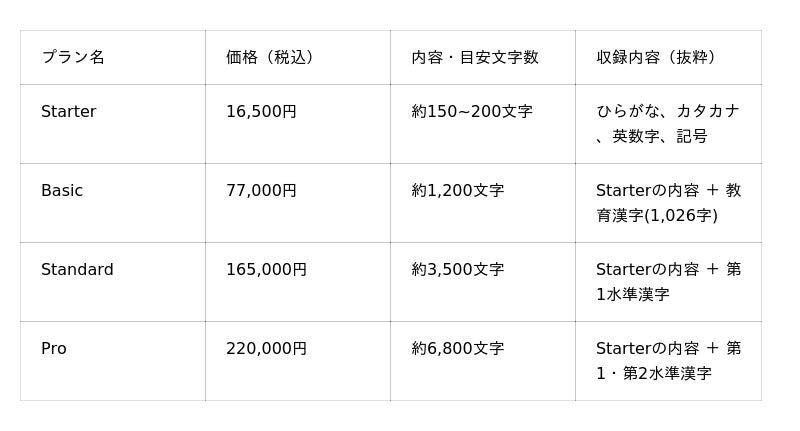 お子様の文字を記念に残したいご家庭から、独自の書体をデジタル化したい書道家の方まで、4つのプランをご用意しました。