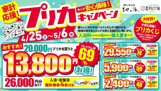 また、光熱費・重油の仕入れ価格が高騰する厳しい状況の中でも、地域の皆さまにこれまで通り安心してご利用いただけるよう、価格維持に取り組みます。さらに、2026年4月25日から5月6日までの期間限定で、お得なプリカキャンペーンもあわせて開催し、日常の入浴時間をより利用しやすい形で応援します。