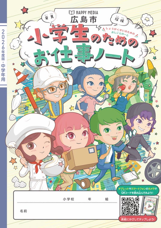 「お仕事ノート」・「お仕事ブック」は、株式会社中広が企画・発行するキャリア教育副教材です。仕事の流れや実際に働く人の声が分かりやすく紹介されているほか、誌面にはQRコードも掲載されており、タブレットやスマートフォンからホームページへアクセスできるなど、子どもたちが楽しみながら学べる工夫が施されています。