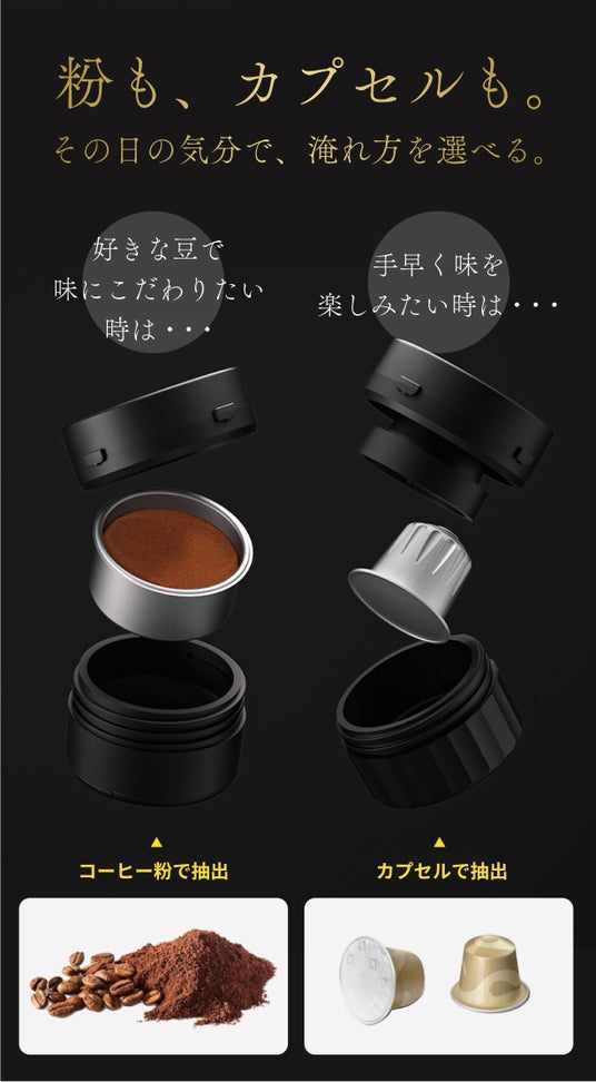 本格的なエスプレッソを3万円台で実現し、家やカフェに縛られずどこでも飲む事が出来ます。