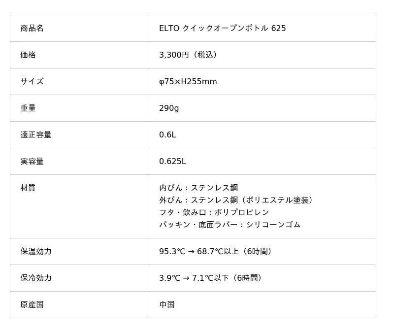 ワンタッチで開いてすぐ飲めるステンレスボトル「ELTO クイックオープンボトル 625」を2026年3月に発売しました。