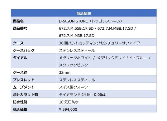 これまで18Kゴールドのみで展開していたセンチュリーの代表作「ドラゴンストーン」は、コレクションに新たな輝きをもたらします。 シリーズ初となるステンレススチール素材を採用した新モデルが誕生しました。