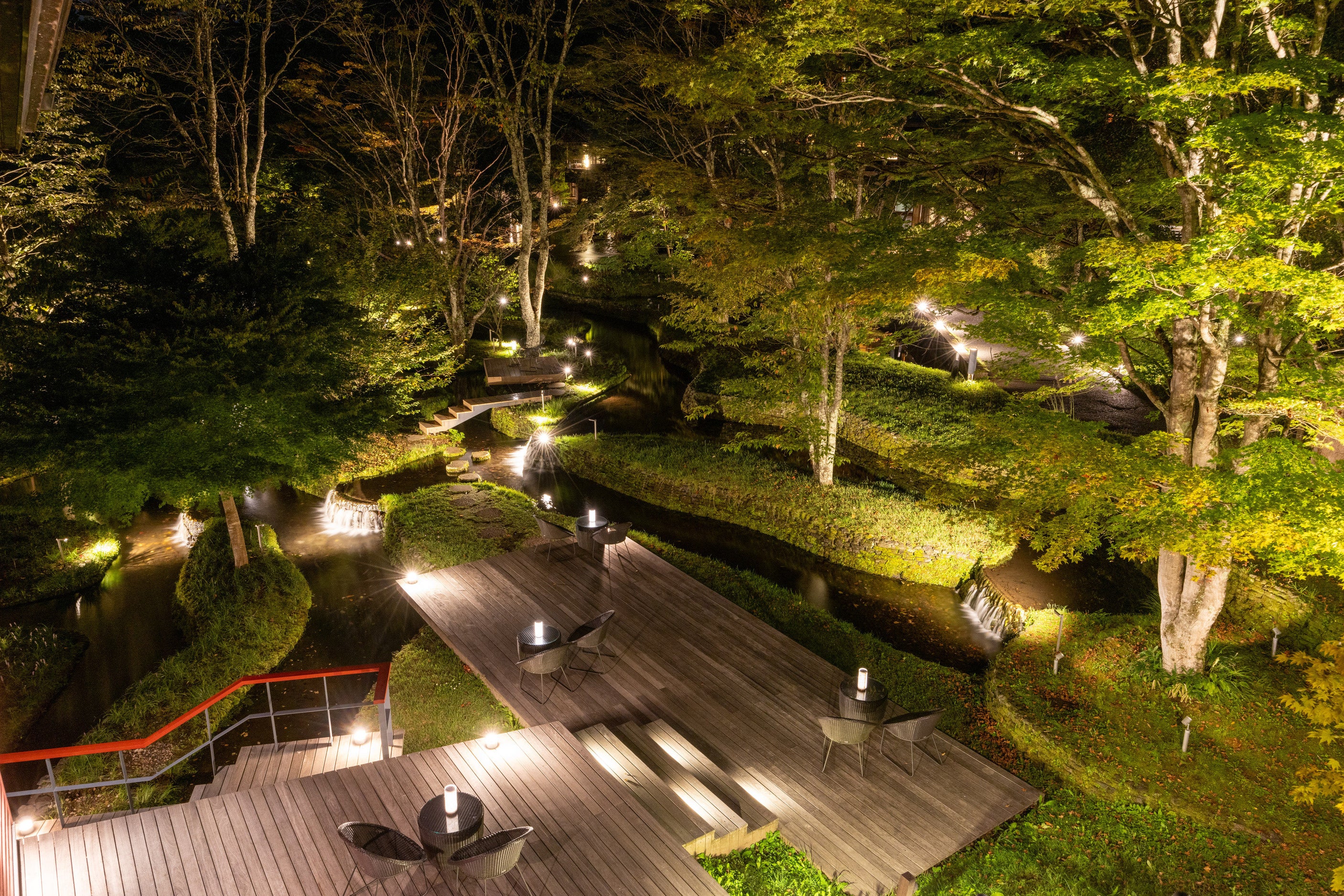 浅間山麓の豊かな自然に囲まれた「星のや軽井沢」には、施設を象徴するランドスケープ「棚田」があります。谷の集落の原風景ともいえるこの場所は、滞在者が四季や一日の移ろいを感じながら過ごす憩いの場です。浅間山麓の清流が幾重にも流れ落ちる棚田は、夏でも水辺特有のひんやりとした冷気に包まれ、天然の涼を享受できる特別な空間となります。この涼やかな情景を最大限に堪能してほしいという想いから、夏の夜限定で「棚田Barラウンジ」を開催します。提供するかき氷は、森そのものを味わう体験として開発。軽井沢の森林から着想を得た樹木を素材に選び、棚田に響く水の音、森を抜ける涼風とともに、五感すべてで軽井沢の自然に没入できるひとときを提案します。