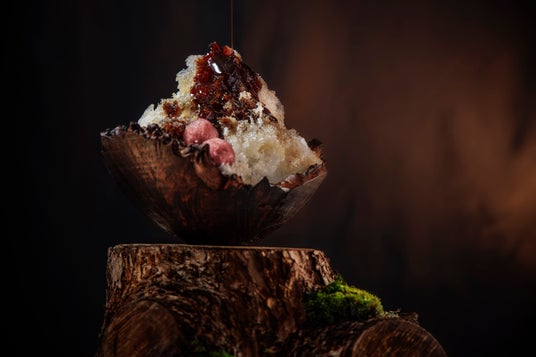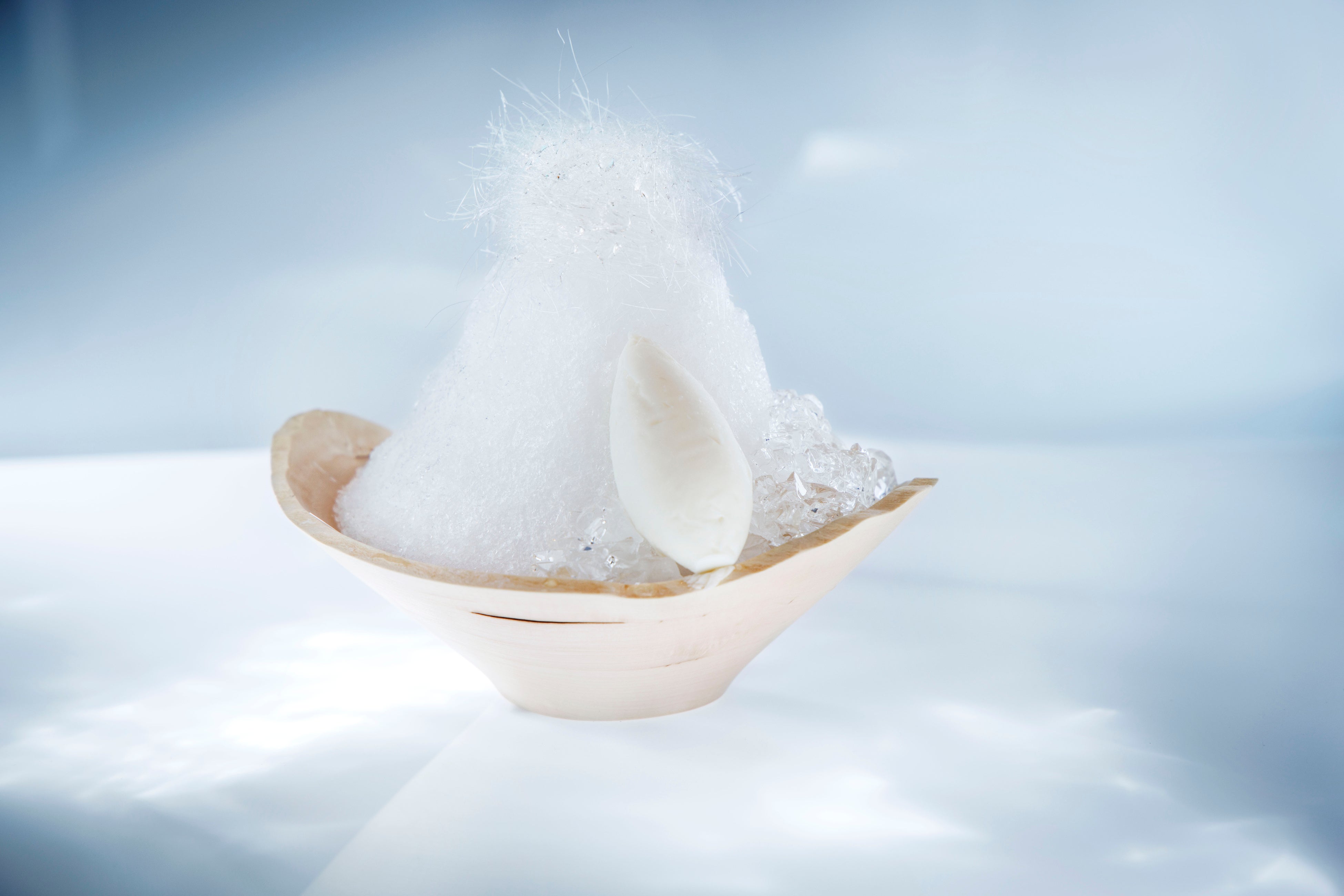 軽井沢に自生する白樺の凛とした姿に着想を得た一品です。使用するのは、雪解け時期の約一ヶ月間しか採取できないと言われる「白樺樹液」。透明感と森の息吹を感じるほのかな甘みが特徴です。 この樹液を用いた特製シロップに、艶やかな白樺ゼリーと、中には軽やかな口当たりのムースを忍ばせました。仕上げに添えるのは、白樺の樹液と枝葉を蒸留した白樺ジンの特製アイスクリーム。樹液の優しい甘みと、ジンの芳醇な香りが重なり、洗練された大人のかき氷です。