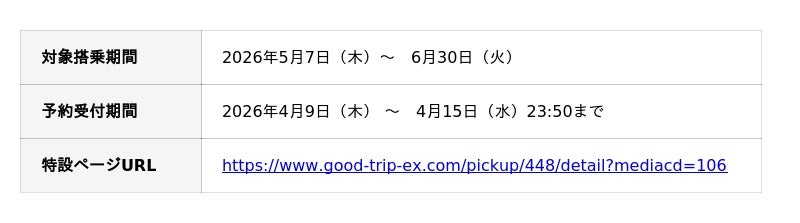 日本空輸株式会社(本社:東京都港区、代表取締役:岡下 敏也)が運営する旅行予約サイト『グッドトリップエクスプレス(グットリ)』は、2026年4月9日より、「フジドリームエアラインズ(FDA)利用のタイムセール」の追加販売を開始いたします。気候の良い5・6月出発分の航空券+宿泊セット予約で、初夏の国内旅行がさらにお得にご利用いただけます。