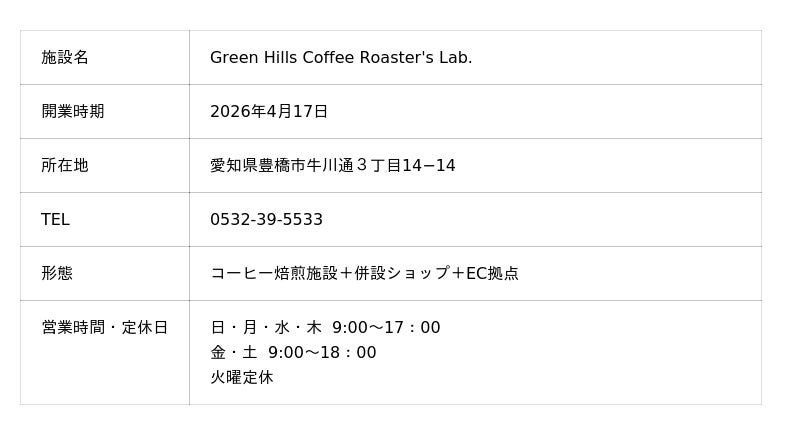 こすたりかグループ(株式会社イデアル・アトレ/本社:愛知県豊橋市、代表取締役社長:岡田直樹)は、2026年4月、コーヒー豆の焙煎施設にショップを併設した新拠点「Green Hills Coffee Roaster's Lab.(グリーンヒルズ コーヒー ロースターズ ラボ)」を、豊橋市内(所在地詳細:牛川町)に開業します。喫茶店の心地よさと、食とサービスへのこだわりを原点に、コーヒーを“コモディティ”ではなく、毎日の暮らしを豊かにする”スペシャルティ”として提案します。焙煎豆の販売に加え、店内での抽出体験、イベントやワークショップなどを通じて、香り・味が循環する場を目指します。