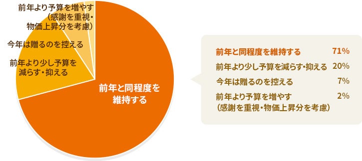 「物価高を受けて、今年の母の日ギフトの予算はどうする予定ですか?」という設問に対し、「前年と同程度の予算を維持する」との回答が71%に達しました。大切な人への贈り物は欠かせないと考える人が大半であることがわかりました。