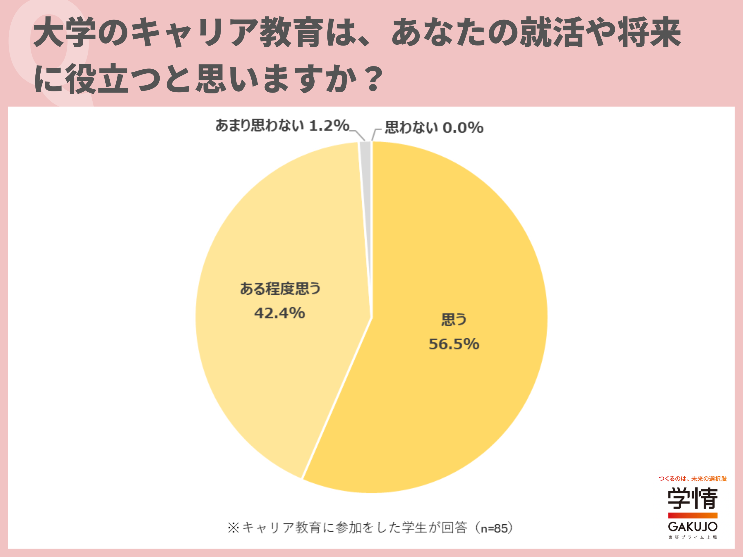 大学のキャリア教育が自分の就活や将来に役立つと思うかについては、「思う」56.5%、「ある程度思う」42.4%で、合わせると98.9%に上りました。