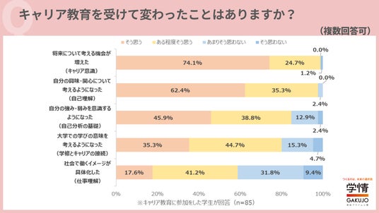 株式会社学情(本社:東京都中央区)は、2028年3月卒業(修了)予定の大学生・大学院生を対象に、大学1~2年生のときの「キャリア教育(大学や企業が実施するキャリア形成支援)」についてインターネットアンケートを実施しました。キャリア教育に参加した学生に参加して変わったことがあるかを尋ねたところ、ほとんどの学生が将来のキャリアや自分について考えるようになったと回答しました。大学での学びの姿勢にも影響を与えており、キャリア教育は、自分や将来のこと、学びについて考えるきっかけとなり、教育効果が極めて大きいことが分かりました。大学のキャリア教育が自分の就活や将来に役立つと思うかについては、ほぼ全員が「思う」「ある程度思う」と回答。「大学での学びや取り組みが社会に出てからどのように活きてくるかを実感でき、モチベーションに繋がる」「知らない知識ややり方などを学び、これからの行動への視野が広がり、迷いが減った」「右も左も分からない状況から、将来のキャリアを考えるための優しい第一歩になった」「同じ大学の先輩がどのような動きで就活を進めたか知ることができた」など、キャリア教育に肯定的な意見が多数寄せられました。