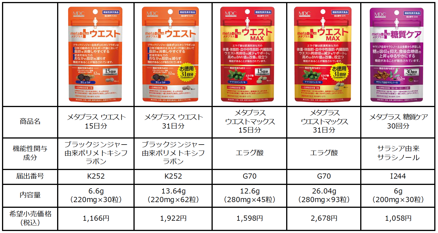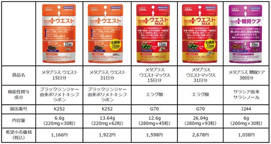 「メタプラス ウエスト マックス」、「メタプラス 糖質ケア」につきましても、内閣府が定める「食品表示基準」の一部改正に合わせ、今春パッケージリニューアルを行い、順次切り替えてまいります。