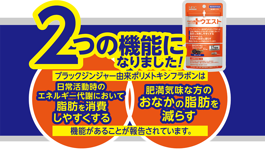 リニューアルによって、 「メタプラス ウエスト」はパッケージが新しくなり、機能性関与成分「ブラックジンジャー由来ポリメトキシフラボン」※2.の機能が、2つに増えました。ブラックジンジャー由来ポリメトキシフラボンは、日常活動時のエネルギー代謝において脂肪を消費しやすくする機能、肥満気味な方の腹部の脂肪を減らす機能があることが報告されています。