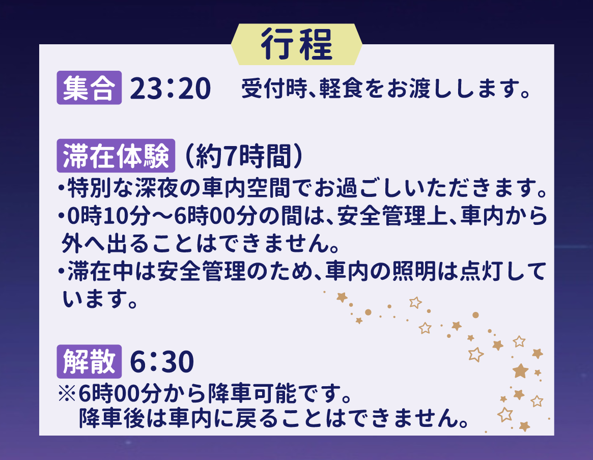 - 本企画は深夜に鉄道車両の車内で過ごしていただくという、特別な空間や雰囲気を味わっていただくイベントです。- 本列車は旅館業法に定める宿泊サービスの提供を行うものではありません。寝具を提供する設備や宿泊に相当するサービスの提供はありませんので、あらかじめご了承ください。