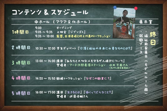内容:短編映画『ジブンゴト』上映、監督・出演者トーク、学生ディベート、講演、職種トークセッション、福祉用具展示 ほか