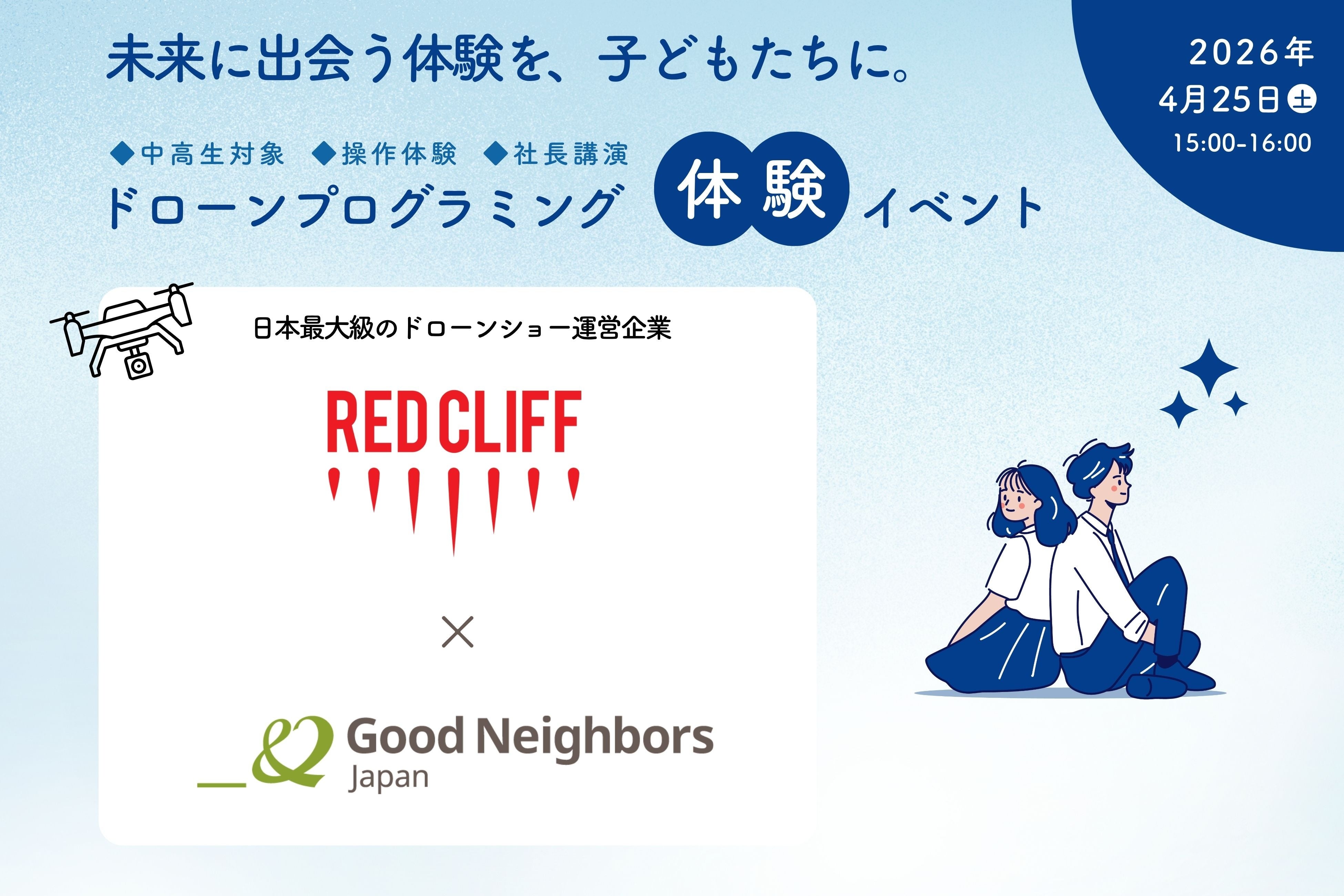 認定NPO法人グッドネーバーズ・ジャパン(本部:東京都大田区、代表理事:小泉 智)は、国内ドローンショー市場でトップシェアを誇る株式会社レッドクリフ(東京都港区)[1]との連携により、ひとり親家庭の中高生を対象とした無料の「ドローンプログラミング体験イベント」を2026年4月25日(土)に開催します。