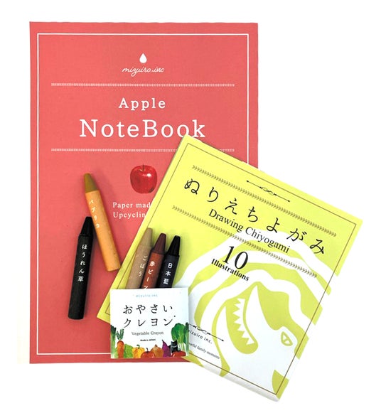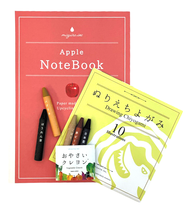 完成したカレンダーを応募者全員にプレゼントするほか、キャンペーンにご参加いただいた方へのプレゼント(特別賞・抽選で50名)として「シークレット賞品」をご用意しています。今年の「シークレット賞品」はアップサイクル文具を含む「お絵描き3点セット」(おやさいクレヨン、青森りんご スケッチブック、ぬりえちよがみ)に決定しました!