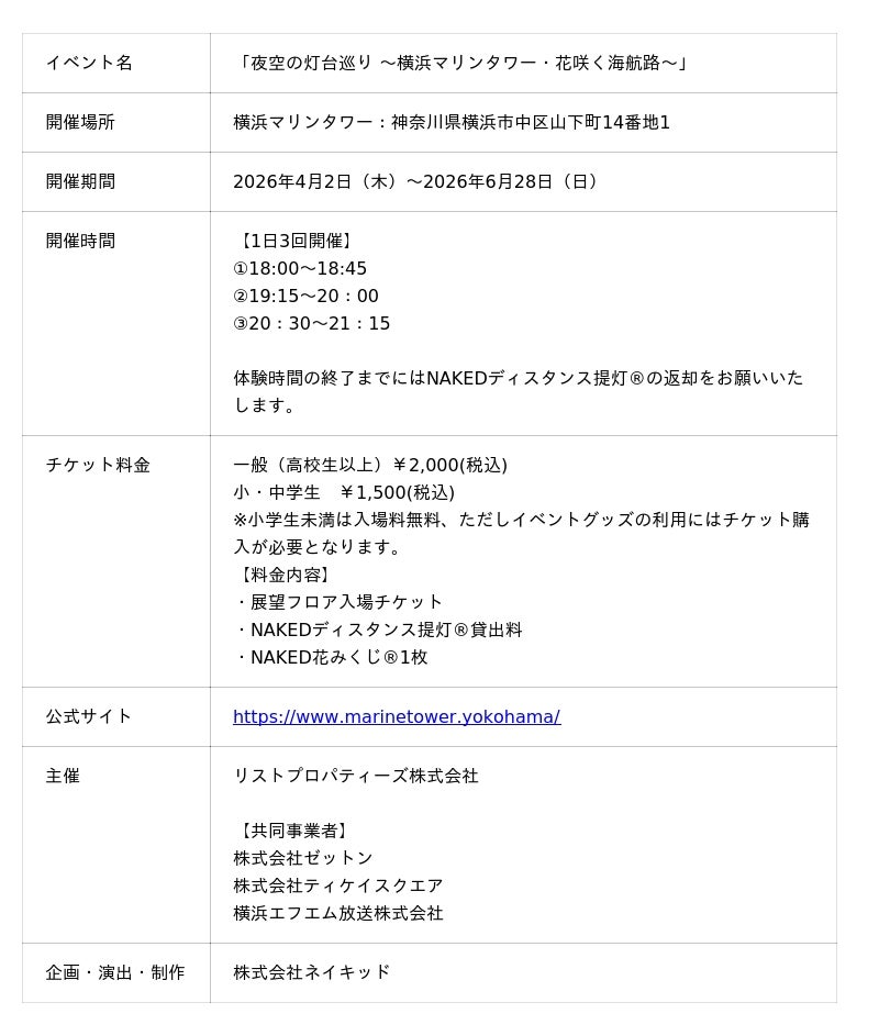 株式会社ネイキッド(英語表記:NAKED, INC. 、 所在地:東京都渋谷区、代表:村松亮太郎)は、リストプロパティーズ株式会社らが運営する横浜マリンタワーにて、2026年4月2日(木)より開催される光のイベント『夜空の灯台巡り ~横浜マリンタワー・花咲く海航路~』に、自社プロダクトである「NAKEDディスタンス提灯(R)」と「NAKED花みくじ(R)」を提供します。