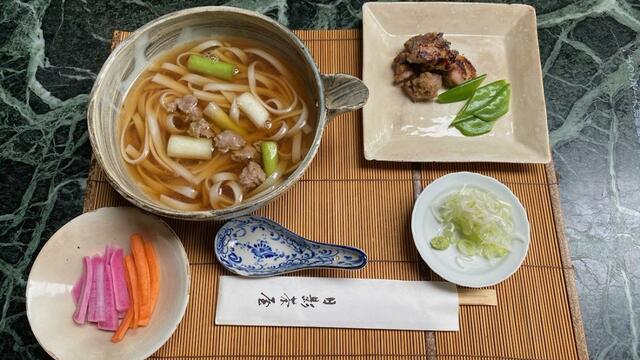 小豆島「甚助」のうどんを煮麺に(おつゆがすごく美味しくできて嬉しい)。発酵ブイヨンをまぶして焼いた鶏肉(これまた旨し)。糠漬け(紫師舞と名付けられていた紫の大根&にんじん)。