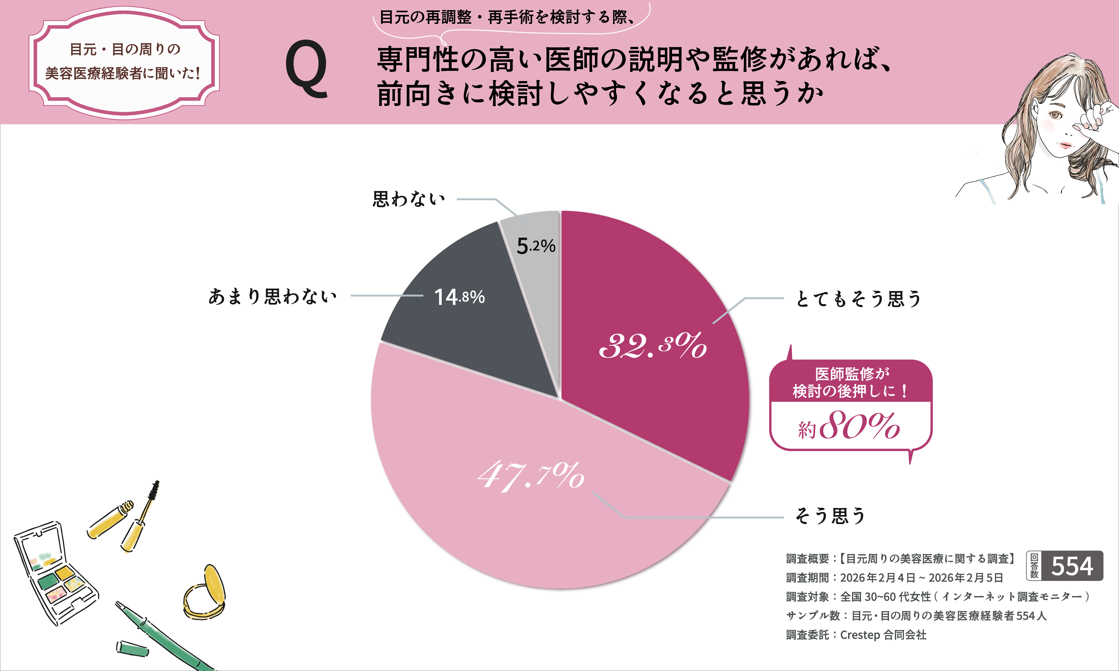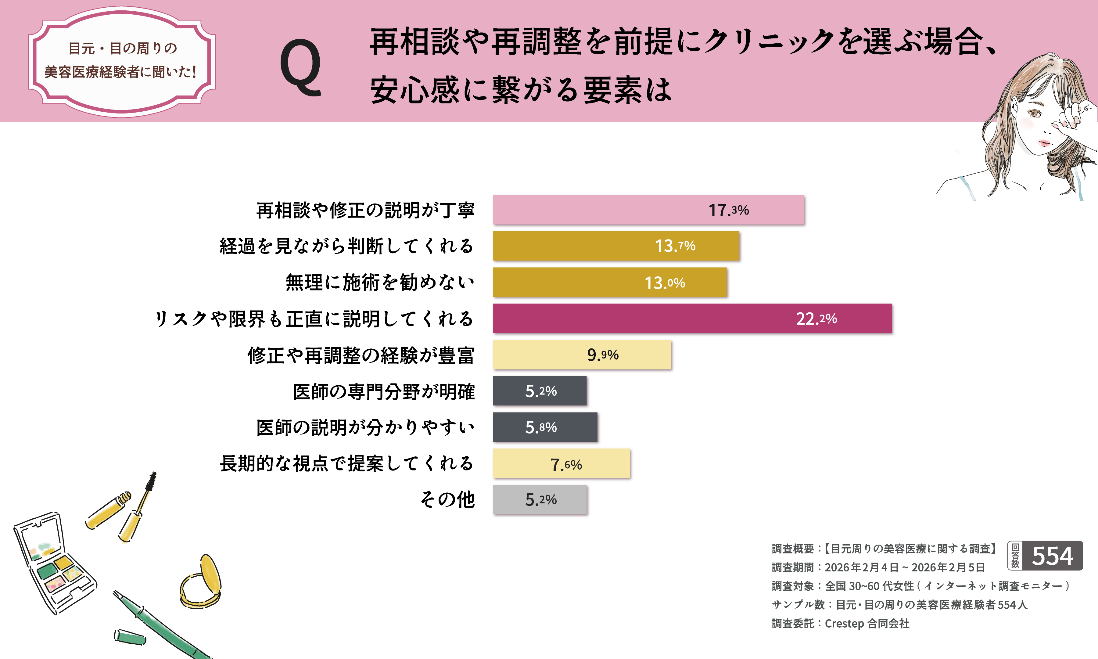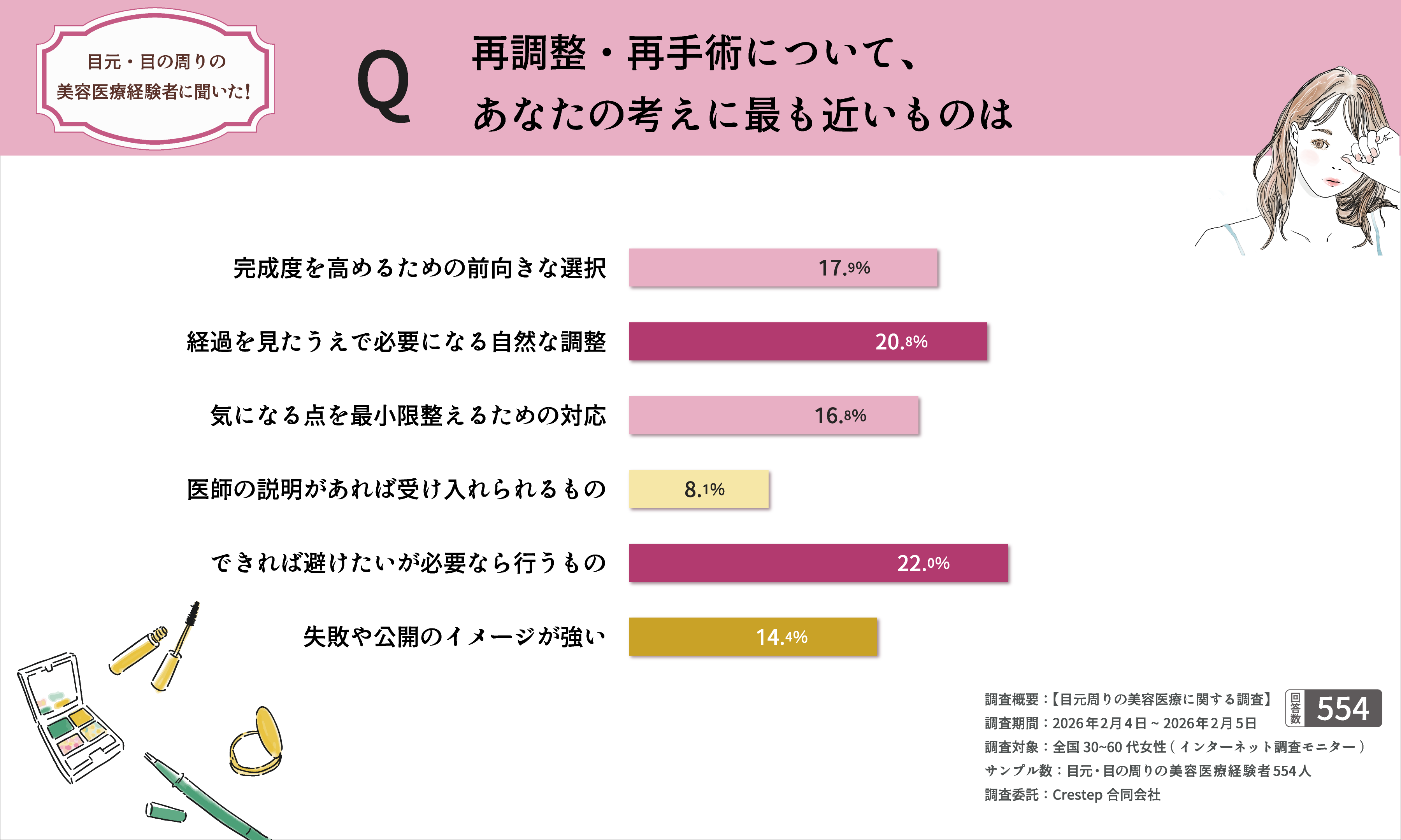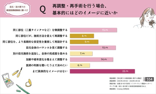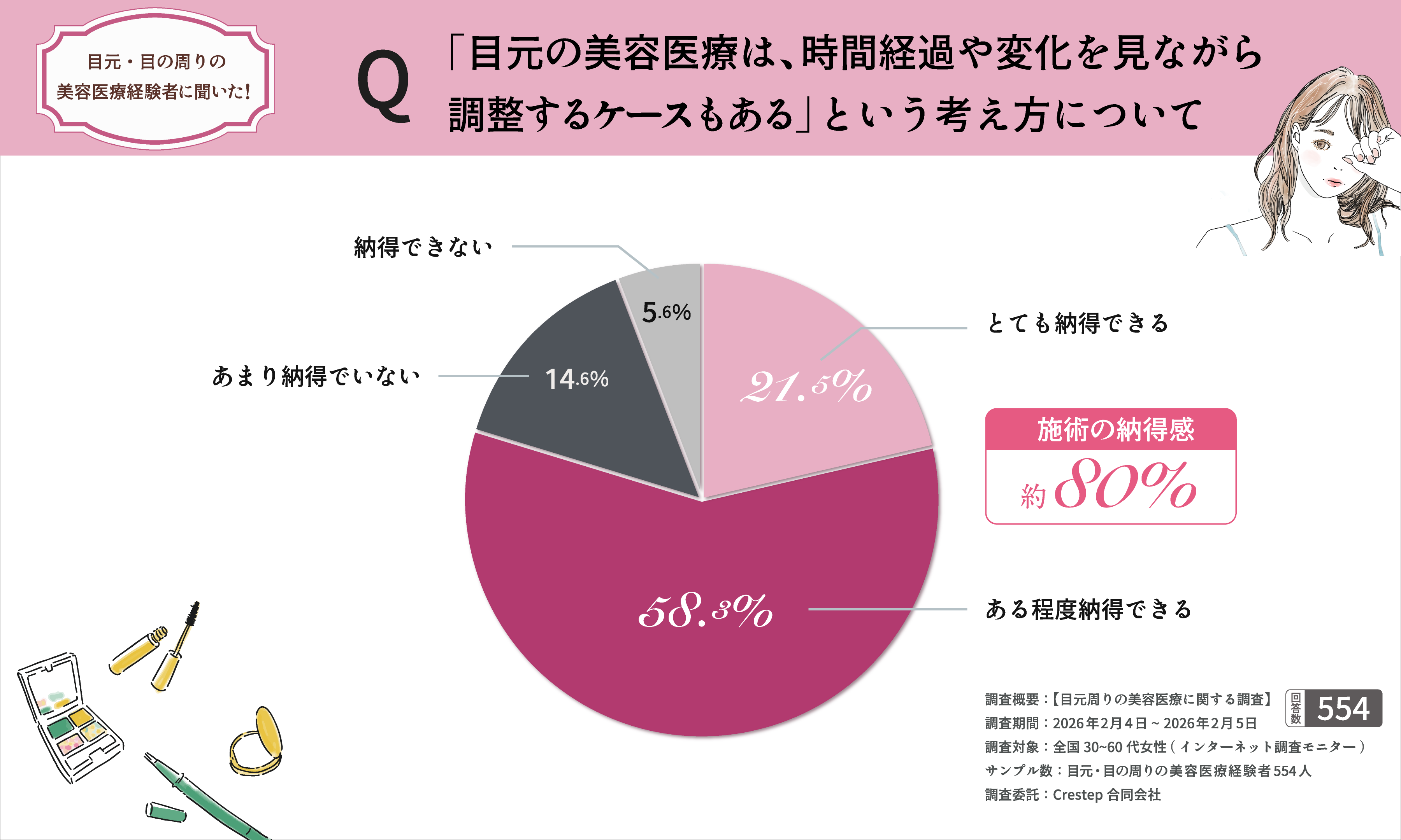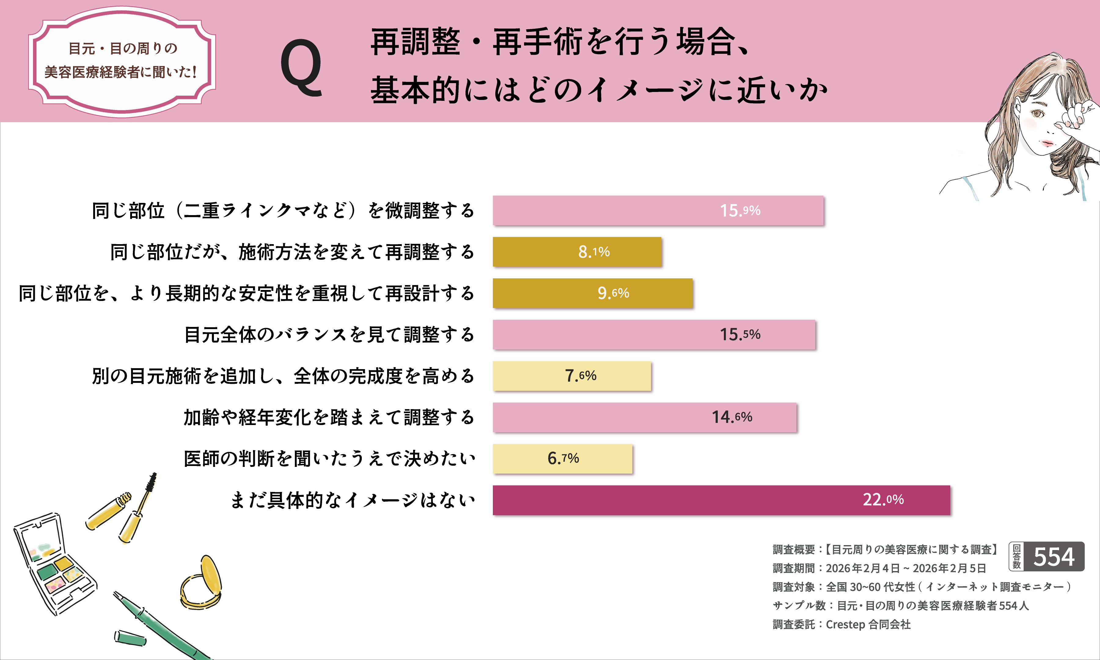 調査名:【目元周りの美容医療に関する調査】調査期間:2026年2月4日~2026年2月5日調査対象:全国/30~60代/女性(インターネット調査モニター)有効回答数:目元・目の周りの美容医療経験者554人調査実施:Crestep合同会社