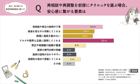 目元・目の周りの美容医療経験者554名を対象に、施術前の不安・施術後の満足度・再相談(再調整)意向を調査。