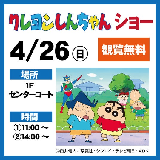 さらに、店頭や4月26日(日)に開催するクレヨンしんちゃんのステージショーでは、しんちゃんの顔型チラシを無料配布します。
