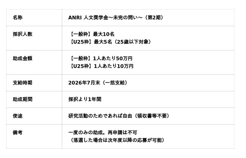 独立系ベンチャーキャピタルANRI(本社:東京都港区、代表:佐俣アンリ、以下「ANRI」)は、2026年4月7日より「ANRI 人文奨学金~未完の問い~」(以下「本奨学金」)の第2期募集を開始いたします。