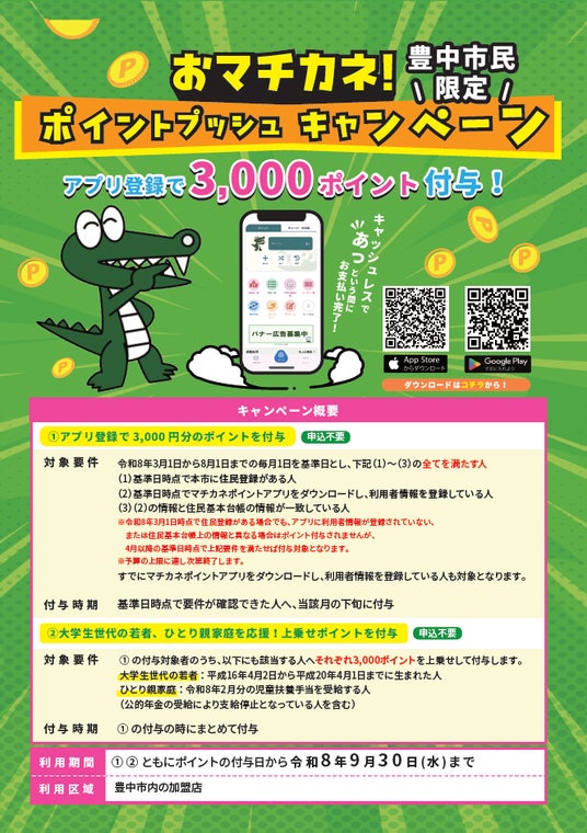 フェリカポケットマーケティング株式会社(東京都文京区、代表取締役:納村哲二、以下当社)は、豊中市に対し、2022年10月より「マチカネポイントアプリ」を提供しております。このたび、同市が実施する市民生活支援および地域経済活性化施策として、2026年3月31日より「おマチカネ!ポイントプッシュキャンペーン」を開始しましたので、お知らせいたします。